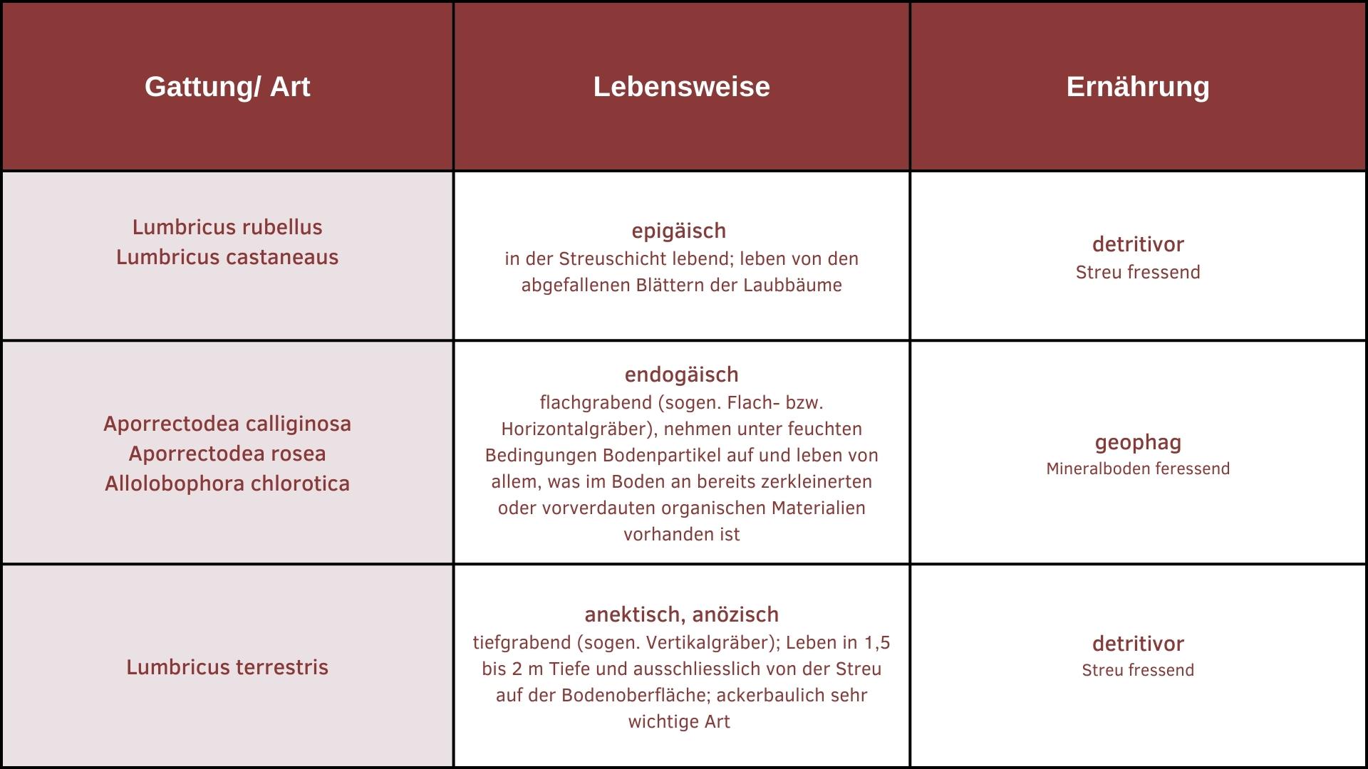 Epigäisch (in der Streu lebend), endogäisch (flachgrabend) und anözisch (tiefgrabend) lebende Arten. Ackerbaulich sind die letzten beiden Arten interessant.